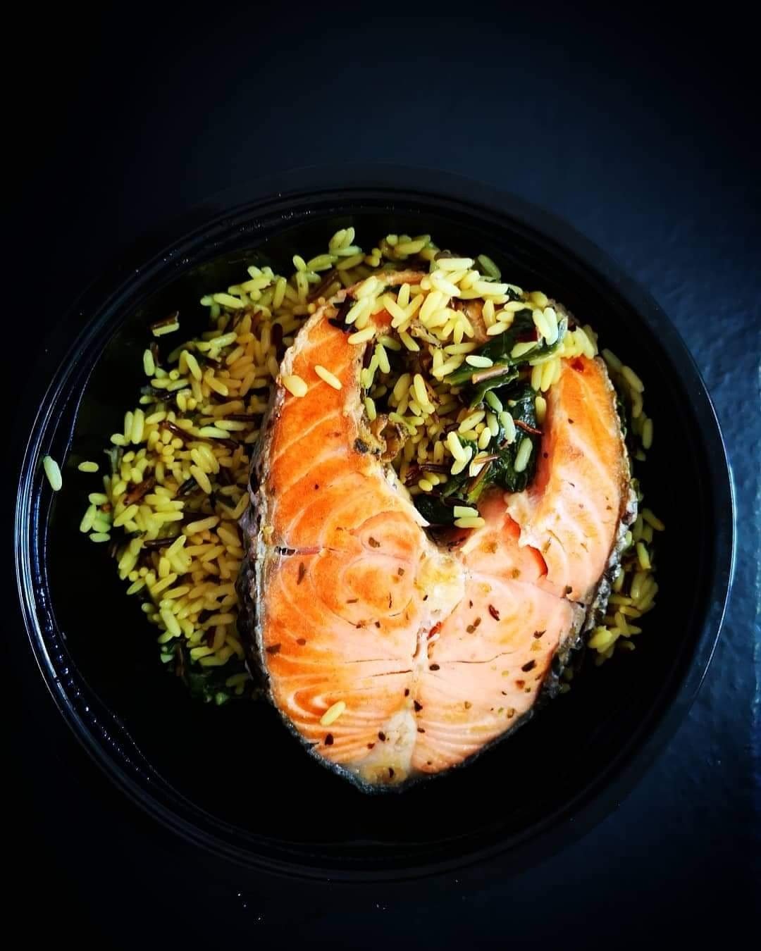 Așa arată un prânz la caserolă : somon, orez sălbatic cu turmeric și spanac!