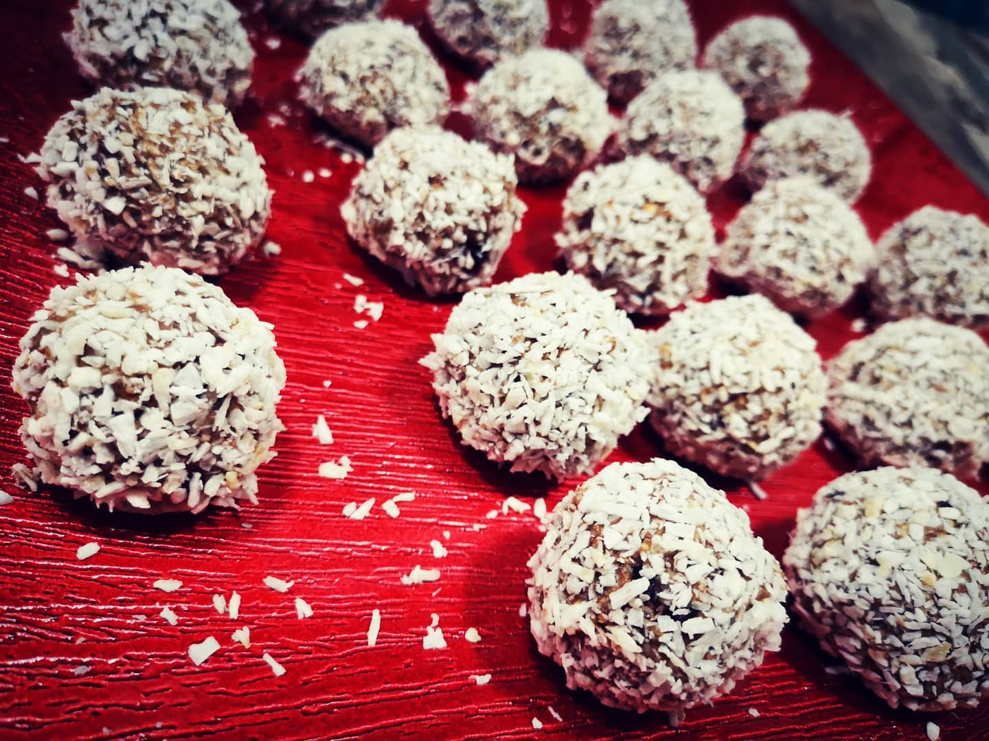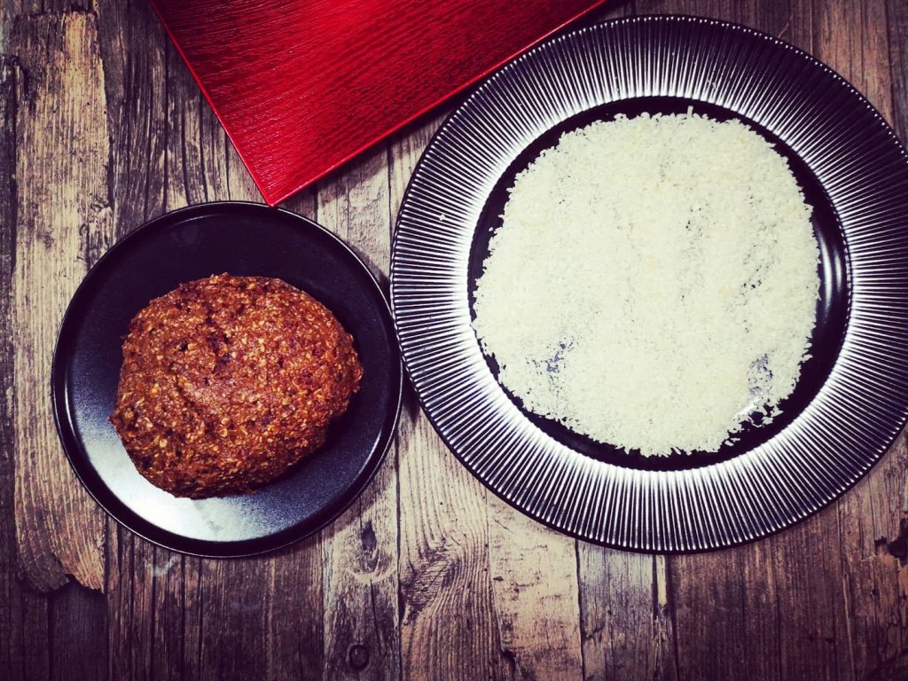 Prepararea este simplă! Ai nevoie de un Blender sau maruntitor pentru curmale și merișoare. După ce le ai mărunțit, adaugi laptele de migdale, cele 30 de grame cacao, esența de rom și fulgii de ovăz, și lași la hidratat. Se adaugă merișoare le și curmalele mărunțite și se amestecă energic. Se obține un fel de cocă. Cam după 30 de minute se fac biluțe (cam cât acelea Raffaelo), ne udam pe mâini cu apă când le facem și dăm biluța obținută prin fulgi de cocos.